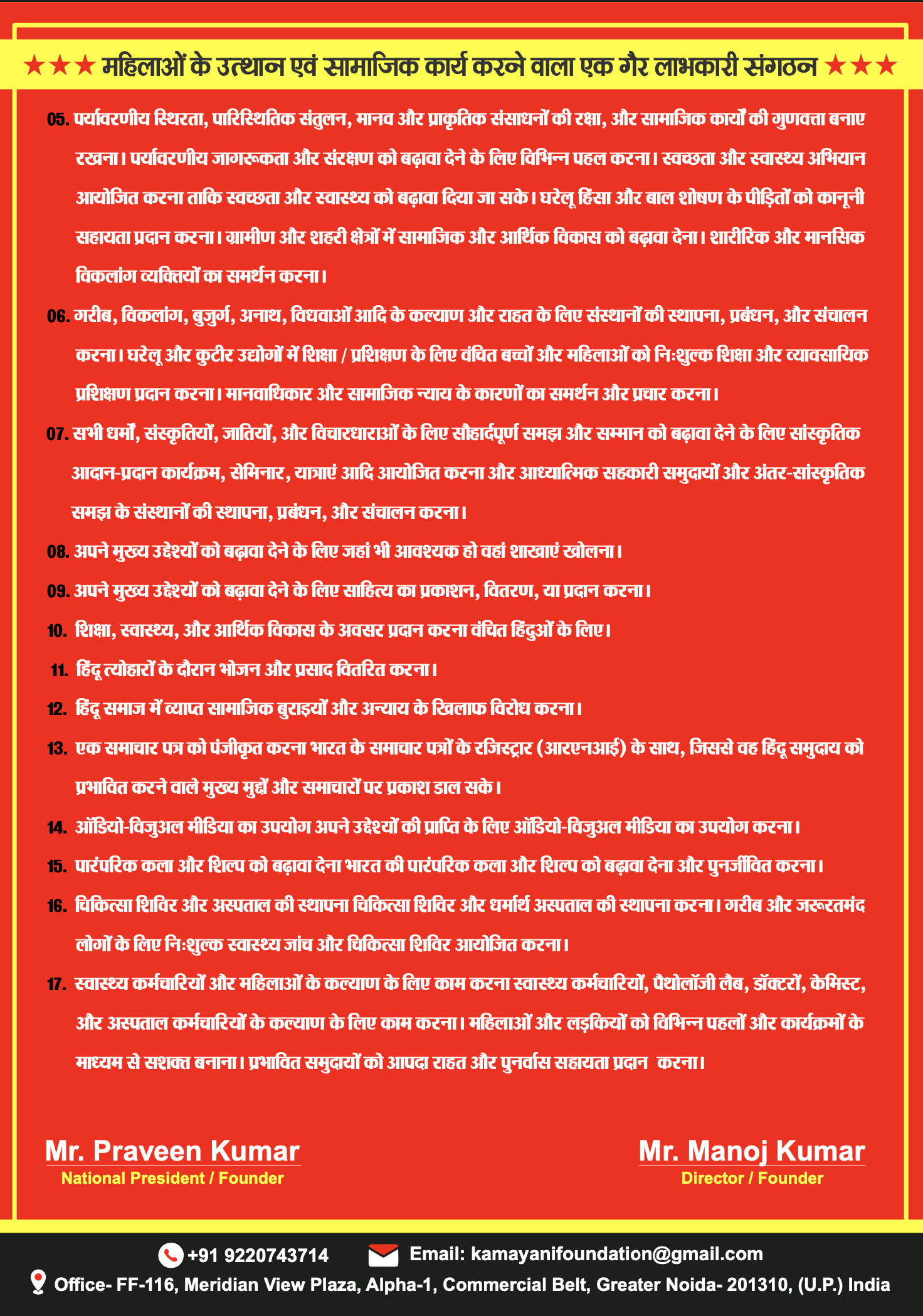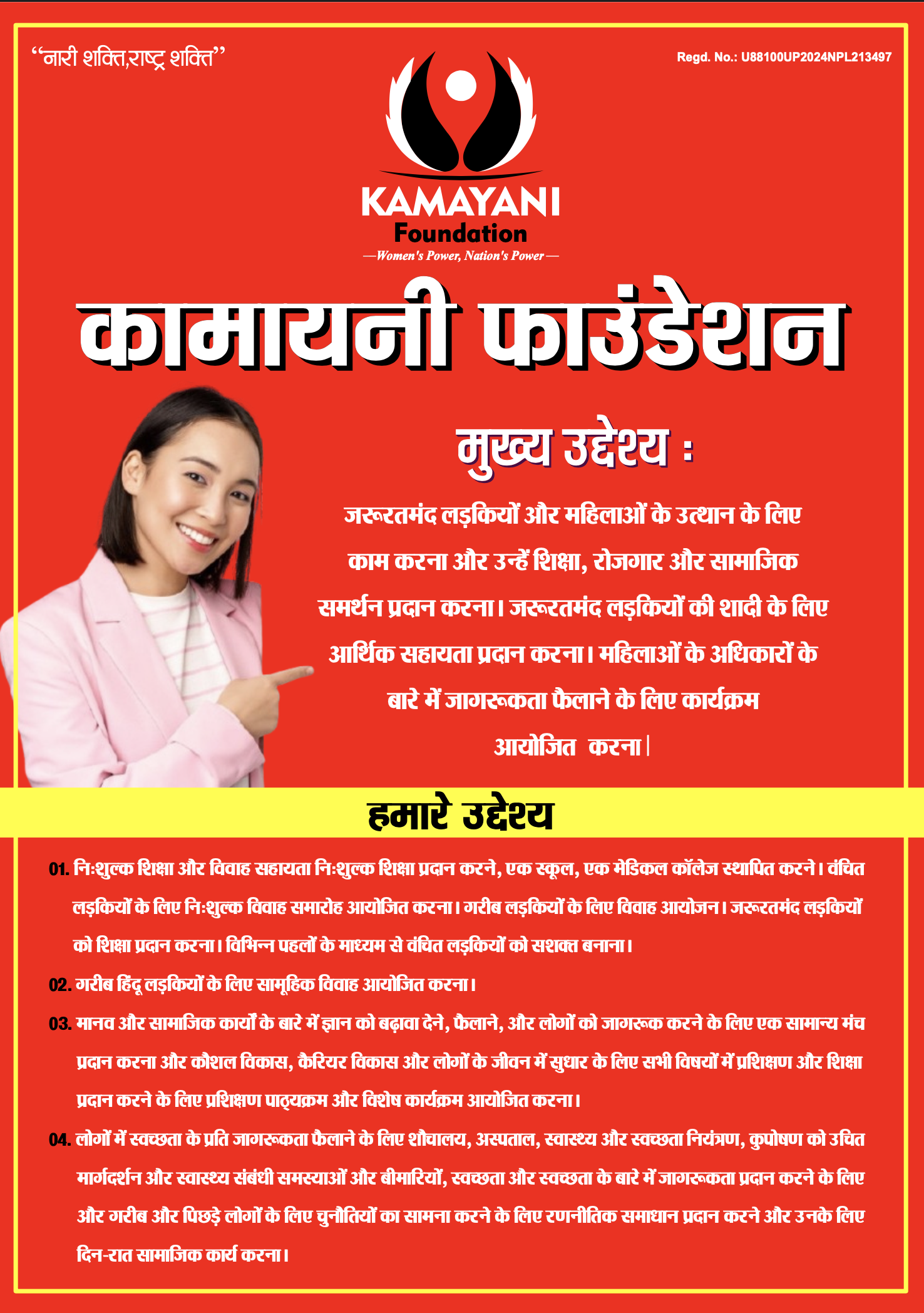 This section contains the foundational bylaws of Kamayani Foundation — a document that reflects not just rules, but responsibilities. It outlines our commitment to educational support, mass weddings, women’s safety, social awareness, healthcare, legal aid, traditional preservation, and much more. From rural sanitation to cultural unity, from child rights to environmental sustainability — each clause in our bylaws ensures that our work stays accountable, transparent, and community-focused.